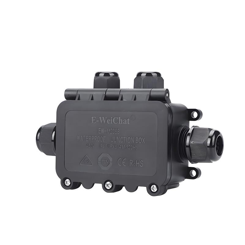 A: The box uses integrated compression cable glands (included) that create a tight, waterproof seal around the cables when tightened.